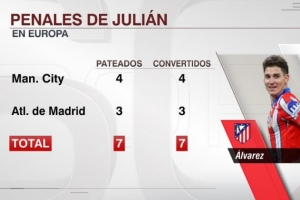 据ESPN统计,阿尔瓦雷斯登陆欧洲联赛以来7次主罚点球,全部命中,其中包括曼城4球、马竞3球。